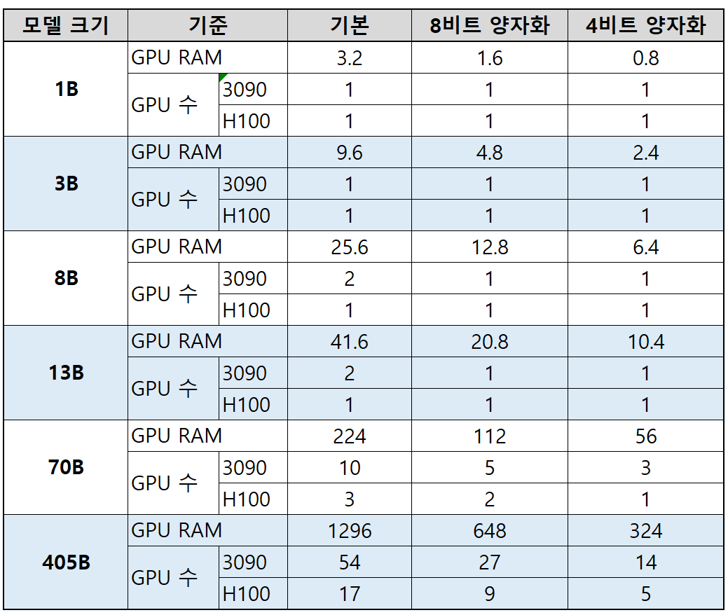 - 405B 모델과 같은 매우 큰 모델은 3090 GPU 기준으로 기본 설정 시 최대 55개, 8비트 양자화 시 28개, 4비트 양자화 시 15개가 필요하며, H100 GPU는 각각 17개, 9개, 5개가 필요합니다.
